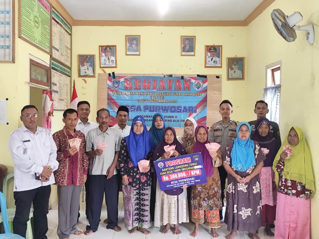 OKU Timur – Pemerintah Desa Purwosari, Kecamatan Belitang II, Kabupaten OKU Timur melaksanakan kegiatan penyerahan Bantuan Langsung Tunai (BLT) Dana Desa yang bersumber dari APBN untuk realisasi triwulan III, yaitu bulan Juli, Agustus, dan September tahun 2025.