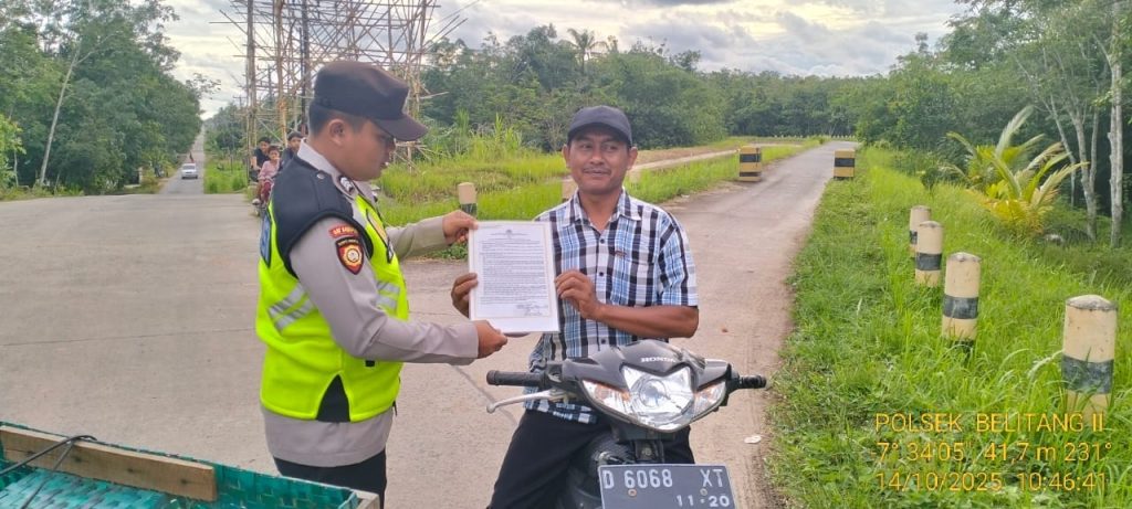 Belitang II – Dalam upaya mencegah terjadinya kebakaran hutan dan lahan (karhutla) di wilayah hukumnya, Polsek Belitang II melaksanakan kegiatan penyebaran maklumat karhutla pada Selasa (14/10/2025) di Jalan Desa Suka Jaya, Kecamatan Belitang II, Kabupaten OKU Timur.