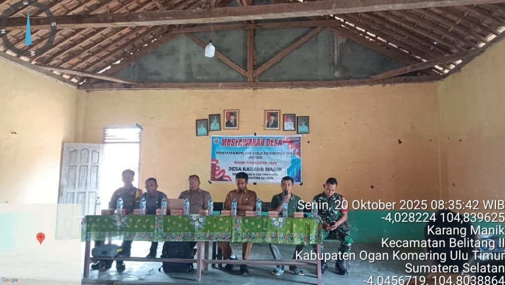 Belitang II, OKU Timur – Pemerintah Desa Karang Manik, Kecamatan Belitang II, menggelar kegiatan Musyawarah Desa (Musdes) dalam rangka perencanaan pembangunan desa untuk penyusunan Rencana Kerja Pemerintah Desa (RKPDesa) Tahun Anggaran 2026, pada Senin (20/10/2025) bertempat di Balai Desa Karang Manik.