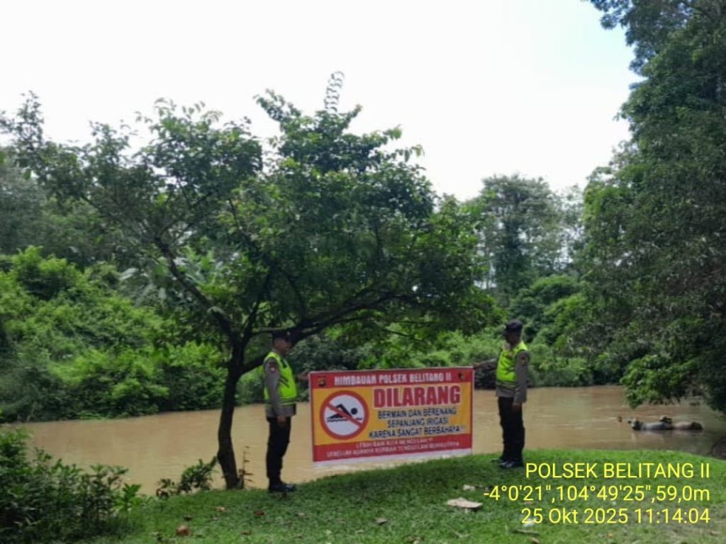 OKU Timur – Dalam upaya meningkatkan kesadaran masyarakat terhadap bahaya bermain dan berenang di sungai, personel Polsek Belitang II, Polres OKU Timur, melaksanakan kegiatan pemasangan spanduk imbauan dan larangan bermain, mandi, serta berenang di sungai, pada Sabtu (25/10/2025) sekitar pukul 10.00 WIB di wilayah Desa Darma Buana, Kecamatan Belitang II.
