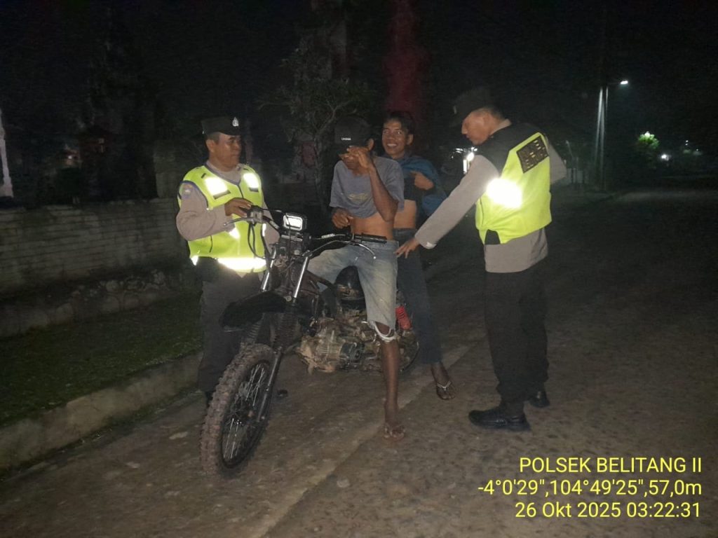 OKU Timur – Dalam rangka menjaga situasi kamtibmas agar tetap aman dan kondusif, personel Polsek Belitang II, Polres OKU Timur, melaksanakan kegiatan patroli malam (dini hari) guna mengantisipasi tindak kejahatan 3C (Curas, Curat, dan Curanmor) pada Minggu (26/10/2025) di wilayah Desa Tegal Besar, Kecamatan Belitang II.