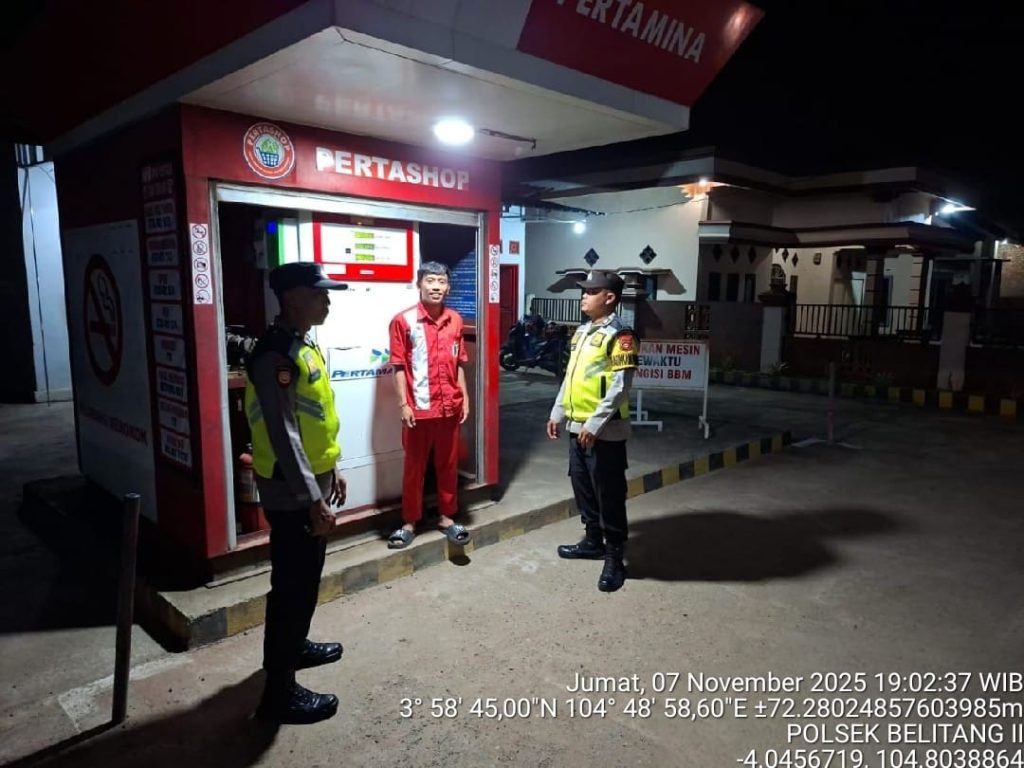 OKU TIMUR – Dalam rangka menjaga keamanan dan ketertiban masyarakat serta memastikan situasi di objek vital tetap kondusif, personel Polsek Belitang II Polres OKU Timur melaksanakan patroli objek vital di Pertashop Desa Sumber Jaya, Kecamatan Belitang II, pada Jumat malam (7/11/2025).
