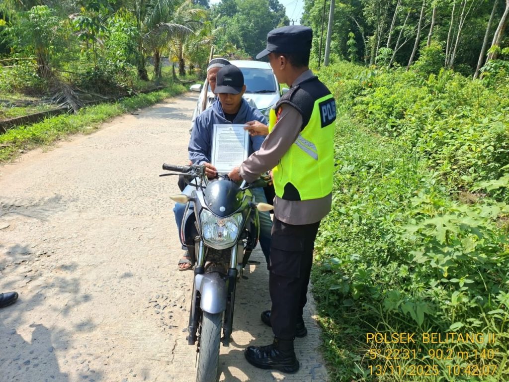 Belitang II – Dalam upaya mencegah terjadinya kebakaran hutan dan lahan (karhutla), Polsek Belitang II melaksanakan kegiatan penyebaran Maklumat Kapolda Sumsel tentang larangan pembakaran hutan dan lahan pada Kamis, 13 November 2025, di Desa Sumber Sari, Kecamatan Belitang II.