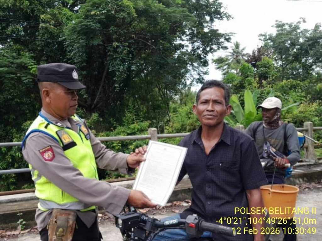 BELITANG II – Menyadari pentingnya menjaga kelestarian lingkungan dan mencegah terjadinya bencana asap yang dapat mengganggu kesehatan serta aktivitas masyarakat, Polsek Belitang II terus proaktif melakukan langkah-langkah preemtif di lapangan. Pada hari Kamis, 12 Februari 2026, tepat pukul 10.30 WIB, personel Polsek Belitang II melaksanakan giat penyebaran Maklumat Kapolda Sumsel terkait larangan membakar hutan dan lahan (Karhutla).